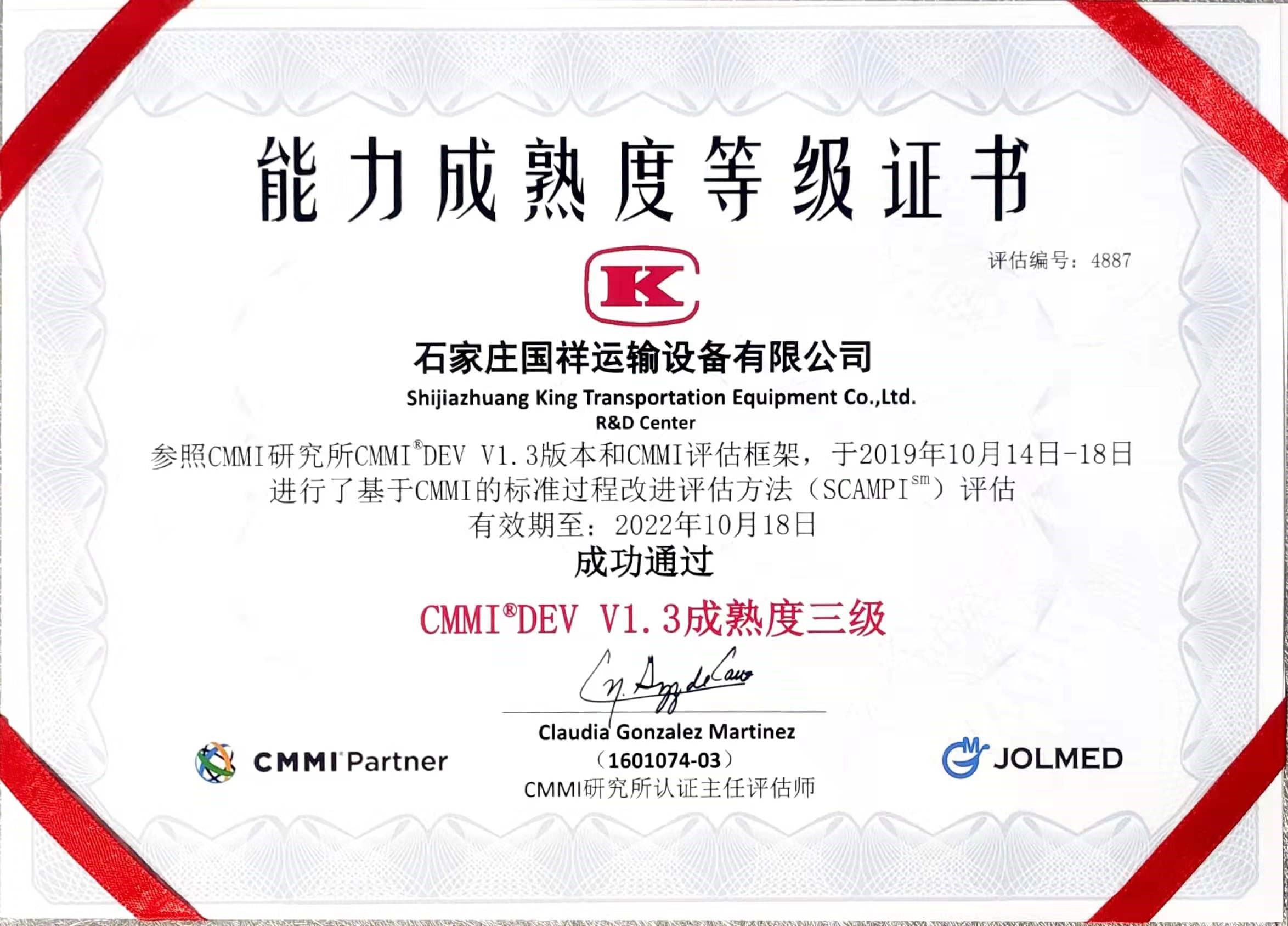 From October 14 to 18, 2019, after strict review and evaluation by Claudia Gonzalez Martinez, the chief appraiser, and the appraisal team, Shijiazhuang King Transportation Equipment Co., Ltd. successfully passed the CMMI-3 review executed by the audit of the U.S. CMMI Research Institute after the online publication of the results on October 18, 2019.