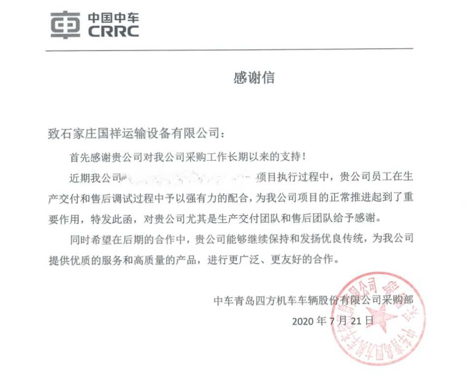 Recently, our company received a thanks letter from Sifang Co., Ltd for our excellent performance in the implementation of various projects of Sifang Co., Ltd. Especially in the production delivery and after-sales commissioning, we played strong cooperation with Sifang Co., Ltd and made great push to its project. Sifang sends this letter hereby to express its thanks to our production delivery team and after-sales team in particular.