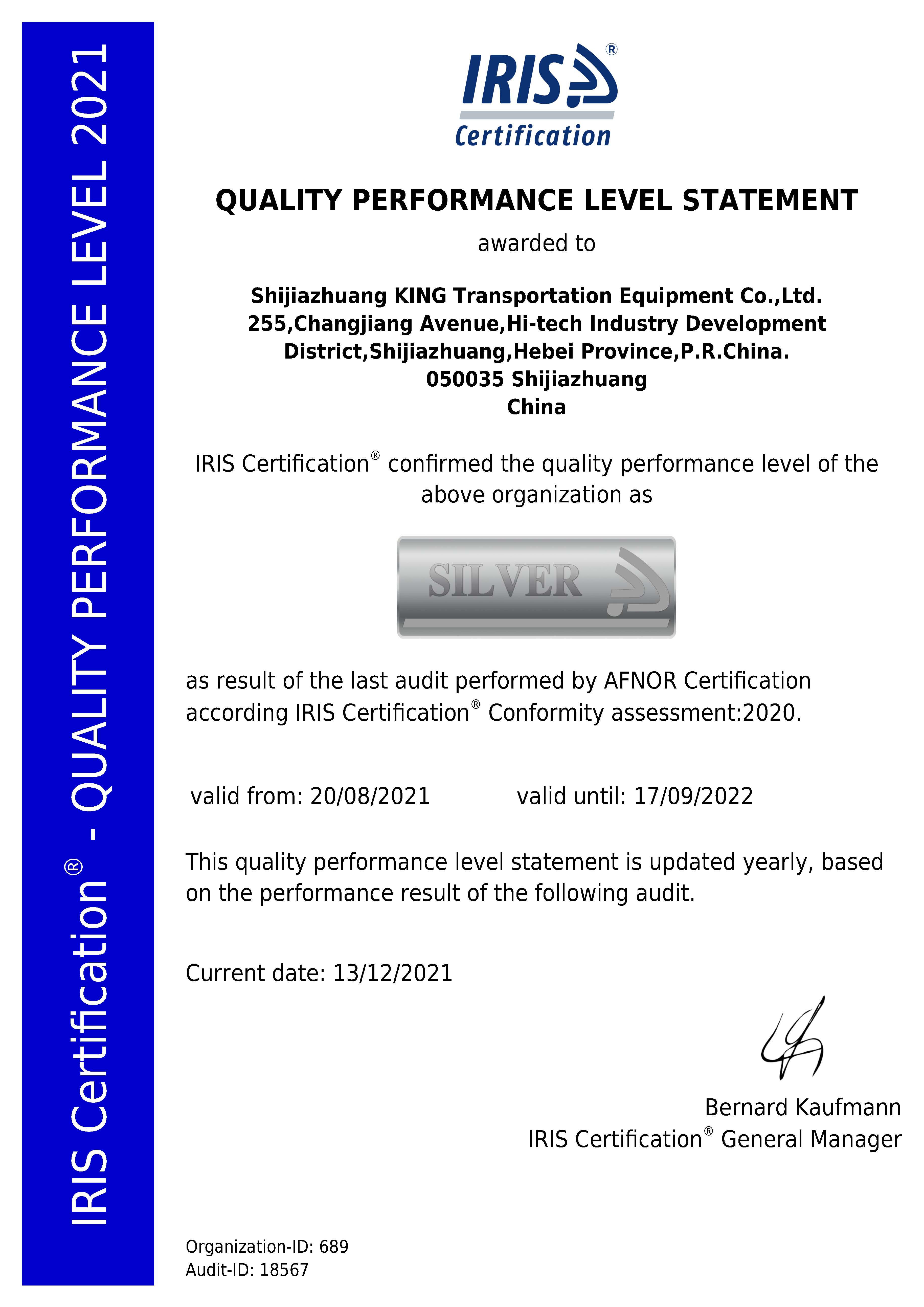 On December 13, 2021, King was awarded ISO/TS 22163 SILVER certificate for its quality performance level by IRIS certification.